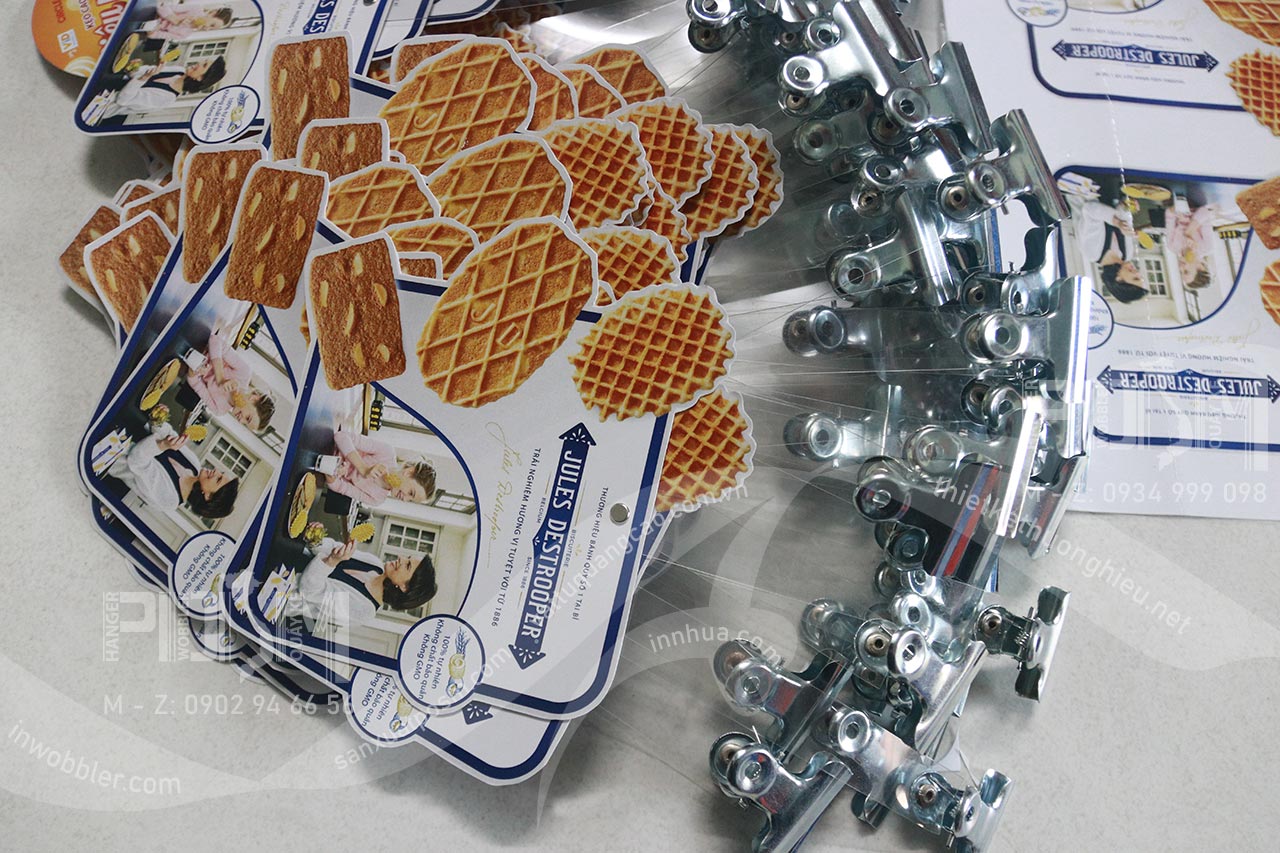 Wobbler thân nhựa rũ, wobbler thân nhựa kẹp sắt được sử dụng giới thiệu sản phẩm bánh quy thương hiệu Jules Destrooper.